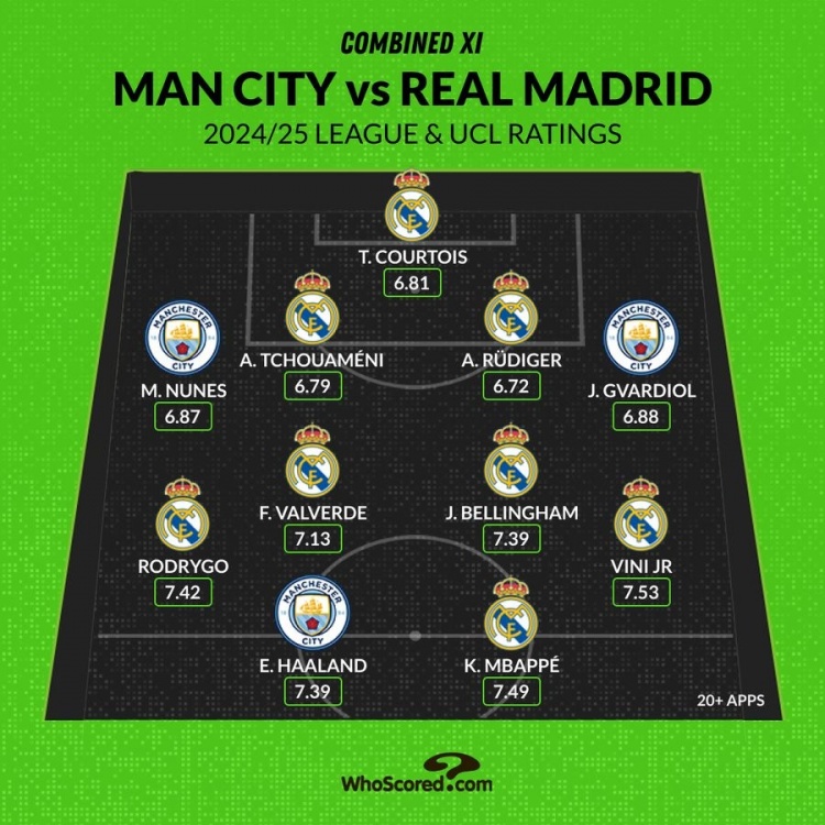 whoscored皇馬曼城本賽季聯(lián)賽+歐冠場(chǎng)均評(píng)分最佳陣:至少出場(chǎng)20次