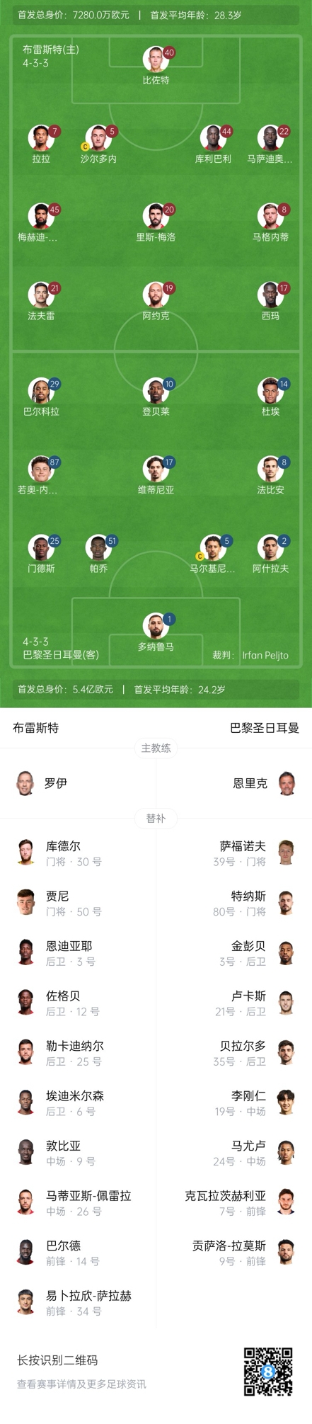 布雷斯特首發(fā):40-比佐特、5-沙爾多內(nèi)、20-里斯-梅洛、22-海達拉44-索瑪拉-庫利巴利、8-馬格內(nèi)蒂、21-法夫雷、45-馬赫迪-卡馬拉、17-西瑪、7-拉拉、19-阿約克