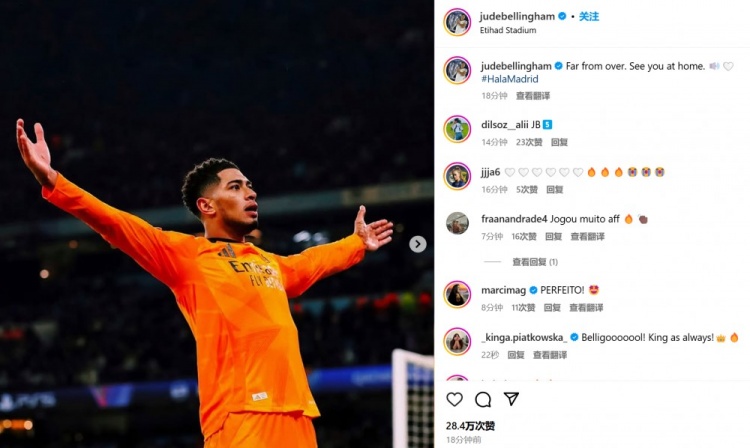 2月12日訊 皇馬在本輪歐冠3-2逆轉(zhuǎn)曼城,貝林厄姆補時打進絕殺。本場比賽第90+2分鐘,劉易斯后場送禮,皇馬獲得反擊機會,維尼修斯單刀球挑射偏出,貝林厄姆快速前插將球打進。貝林厄姆也在賽后通過社媒曬出自己經(jīng)典的張臂慶祝照,并配文:“一切遠未結(jié)束。我們主場再見。馬德里前進!” 本文標(biāo)簽: 足球 西甲 皇家馬德里 英超 曼城 歐冠