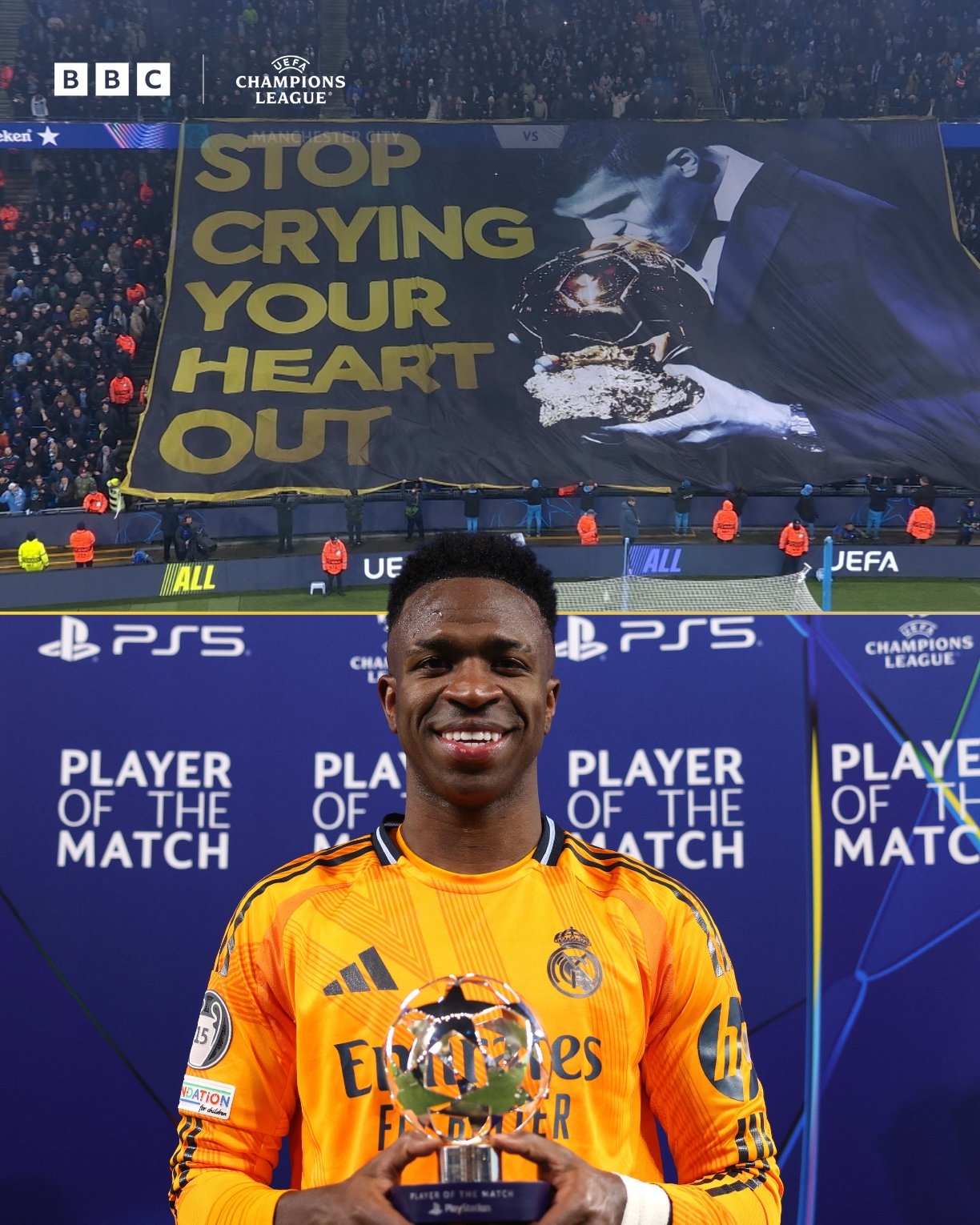 表現(xiàn)回應(yīng)!曼城球迷橫幅嘲諷維尼修斯,后者送絕殺助攻+當(dāng)選MVP