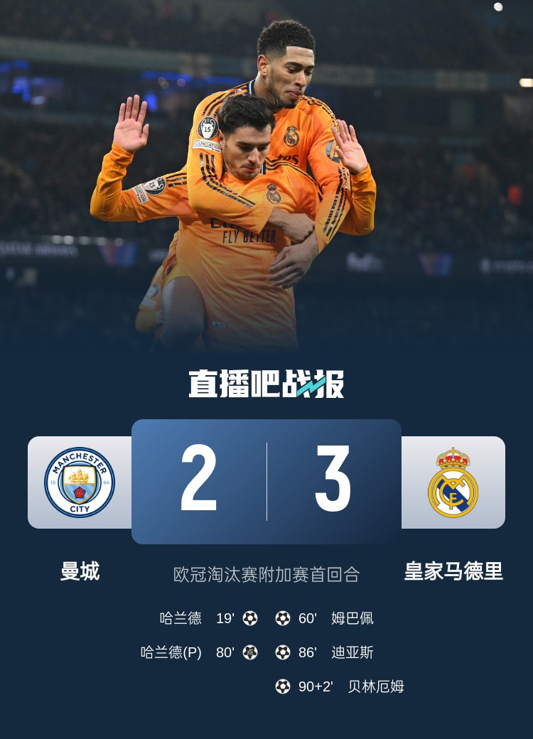 哈蘭德雙響,貝林厄姆絕殺,皇馬3-2曼城,占據(jù)先機。