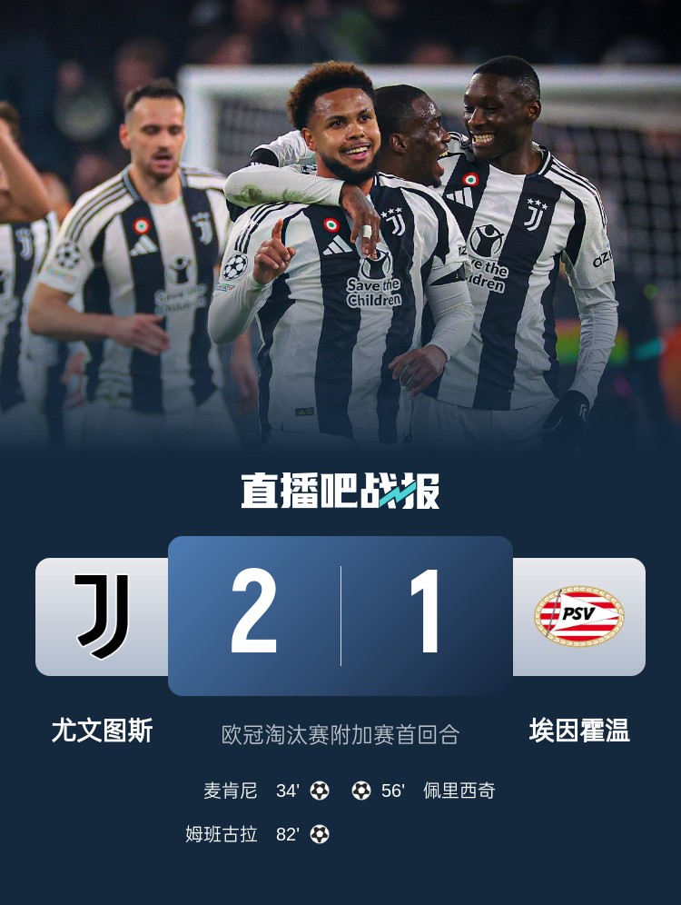 姆班古拉替補制勝,尤文2-1埃因霍溫,雙方次回合將于2月20日移師埃因霍溫主場菲利普球場進行。