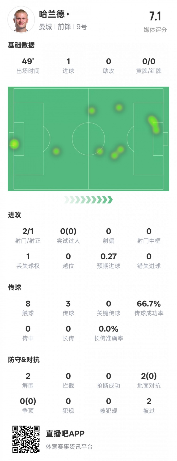 2月12日訊 歐冠淘汰賽附加賽首回合,曼城半場暫1-0領先皇馬。哈蘭德首發(fā)出戰(zhàn),打進1粒進球,半場評分7.1。哈蘭德半場數據如下:進球1助攻0射門2射正1丟失球權1預期進球0.27觸球8傳球3傳球成功率66.7%解圍2地面對抗2地面對抗成功0被過2 本文標簽: 足球 英超 曼城 哈蘭德 歐冠