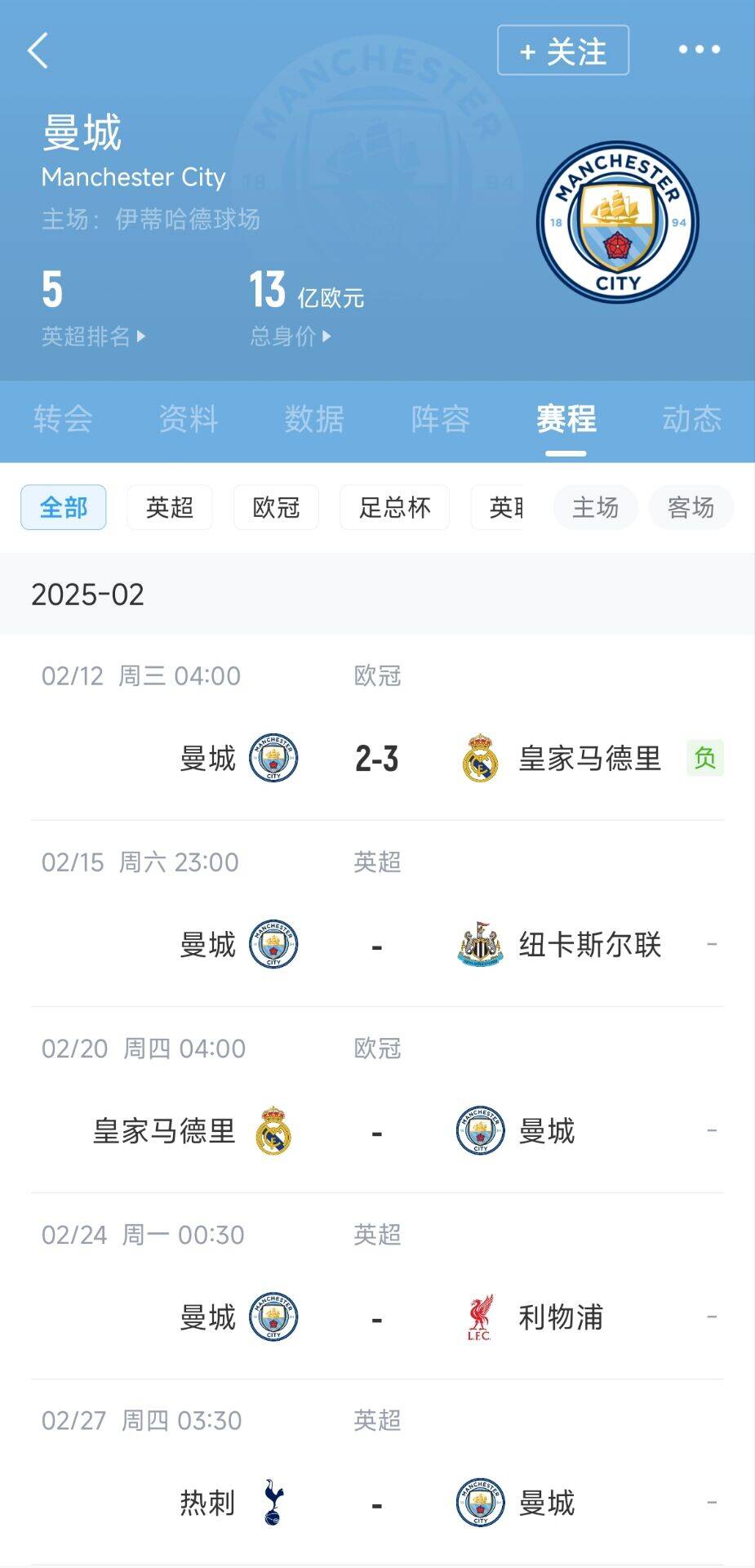 02月12日訊 曼城在歐冠附加賽的首回合2-3不敵皇馬,藍(lán)月亮的魔鬼賽程首戰(zhàn)告負(fù)。接下來(lái),曼城將要面對(duì)的是:紐卡、皇馬、利物浦、熱刺…… 本文標(biāo)簽: 足球 英超 曼城 西甲 皇家馬德里 利物浦 紐卡斯?fàn)柭?lián) 熱刺